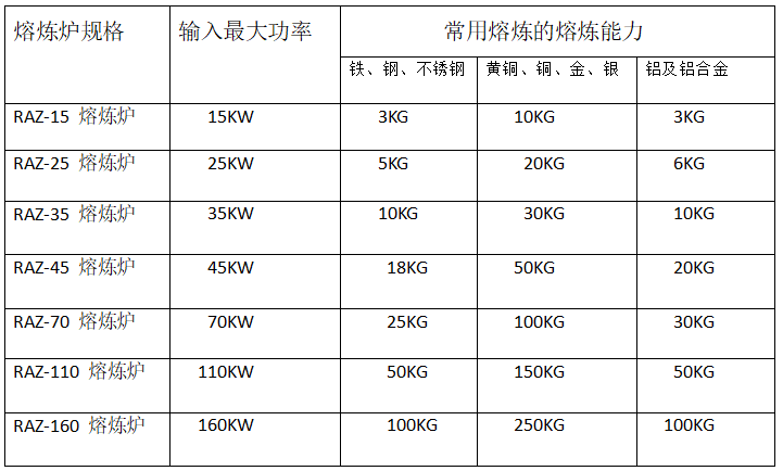 The maximum heating capacity of each melting furnace is listed in the table below. When the furnace is cold, the melting time of each furnace is 50--60 minutes, and when the furnace is hot, the melting time of each furnace is 20--30 minutes.